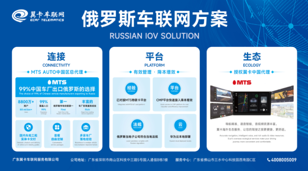 首先在合作伙伴方面,翼卡车联网与MTS公司紧密携手,MTS公司作为中国车厂进军俄罗斯市场的优选合作伙伴,凭借卓越的服务和深入的市场布局,赢得了广大用户的信赖。翼卡车联网凭借丰富的行业经验和专业技术,与MTS公司紧密合作,获得MTS AUTO中国区总代理授权。据悉,目前已顺利实现了与MTS物联卡平台的对接,并通过CMP平台的快速接入,有效降低成本,提高效率。同时,翼卡车联网在俄罗斯当地成立子公司,组建三语服务团队,以更好地满足车厂客户的多元化需求,并确保业务活动的合规性。