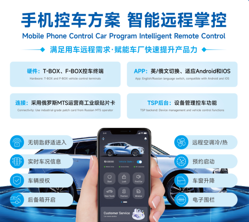 为了满足海外用户对远程用车的需求,翼卡车联网还带来了其海外手机控车方案。该方案已在出口俄罗斯的某车厂成功落地,方案包括T--BOX、F-BOX控车终端、APP、俄罗斯MTS运营商工业级贴片卡、TSP后台实现设备管理控车功能等。海外用户可以通过手机轻松实现车辆控制、实时监控和远程控制等功能,让用车更加便捷、高效。